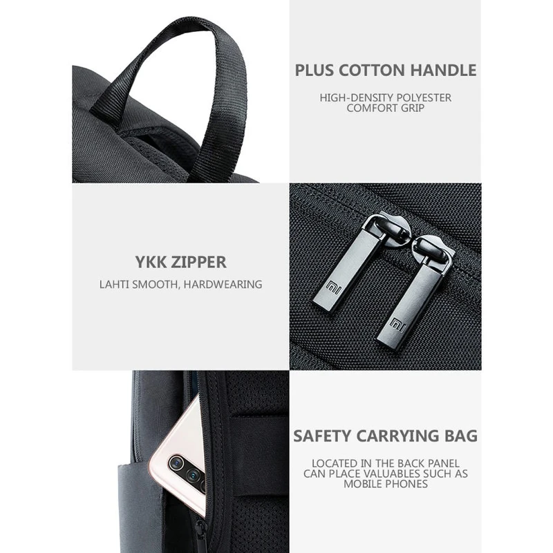 کوله پشتی لپ تاپ شیائومی مدل JDSW02RM با ظاهری کاملا ساده و شیک ، مناسب برای لپ تاپ تا سایز 15.6 اینچ طراحی شده که از نظر ظاهری به خوبی با سبکهای رسمی و اداری و همچنین سبکهای اسپورت نیز هماهنگ میشود . این کوله پشتی زیبا با وزن سبک را میتوانید برای مدرسه ، دانشگاه و … استفاده کنید و برای آقایان و بانوان نیز مناسب میباشد .محفظهی لپ تاپ درون محفظهی اصلی قرار دارد که علاوه بر آن فضای زیادی برای سایر وسایل نیز تعبیه شده که این فضا نیز دارای قسمتهای تفکیک شده میباشد .در قسمت جلویی 2 محفظهی زیپ دار تعبیه شده که دسترسی آسان تری دارند و برای وسایل کوچکتر مناسب میباشند .متریال آن از جنس پارچهی آب گریز است و در برابر پاشش آب نیز مقاوم است و در هوای بارانی از لپ تاپ و سایر وسایل شما محافظت میکند .قسمت پشتی از توری قابل تنفس تشکیل شده و از تعریق نیز جلوگیری میکند و یک بند برای قرار گرفتن بر روی چمدان دارد .اگر در مکانهای عمومی و شلوغ نگران دزدیده شدن وسایل مهم تان هستید ، یک محفظهی زیپ دار کوچک در قسمت پشتی کیف قرار دارد .در دو طرف آن محفظهای برای قرار گرفتن بطری یا لوازمی شبیه به آن نیز وجود دارد .